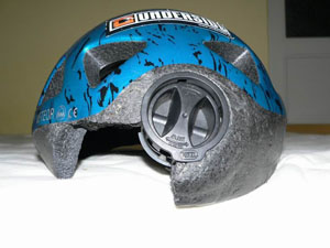 Takhle vypadá helma po 15m držce…….,ještě že sem někdo nemusel na ukázku dávat fotku mojí hlavy, že? Chtěl jsem původně napsat i něco o tom proč si místo normálního osmičkovýho hruďáku koupím takovej ten vymazlenej, ale koho zajímá fotka mých modrých zad :-)