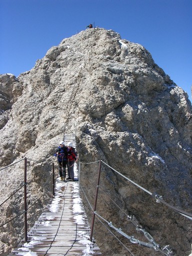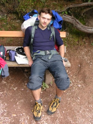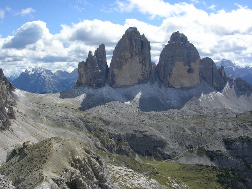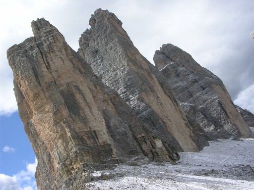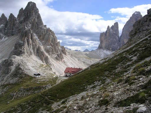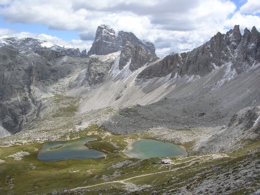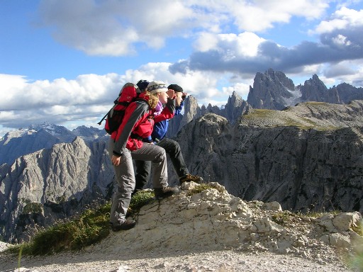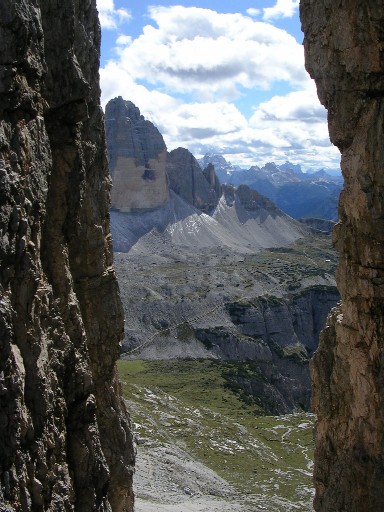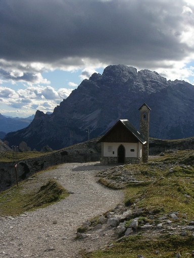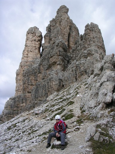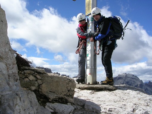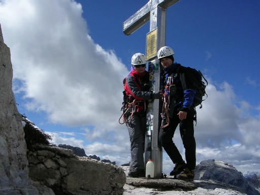Zde jsme strávili dva příjemné dny. Počasí nám konečně začalo přát a dovolilo se nám obléci do lezeckého. Autem jsme se dostali až k Rif. Auronzo (vjezd za 20 éček) a dále jsme museli šlapat po svých. Hodinová procházka kolem Tre Cime di Lavaredo byla příjemným začátkem. U chaty Locatelli jsme nasadili matroš a šlapali k severní stěně Toblinger Knoten (2617 m n.m.), kde začíná pěkná červěňoučká ferrata. Zadarmo rozhodně nebyla. Teplota kolem nuly, stín, pěkný vichr, přiměřená expozice. A pocity na vrcholu? Tak v první chvíli jsem si říkal, jaký jsem to blbec, že nemám s sebou nálepku LBE. Vrcholový ocelový kříž byl polepen od hlavy až k patě :-). Ale jinak se o pocitech tam nahoře mluvit nedá - každý přece ví…:-)))