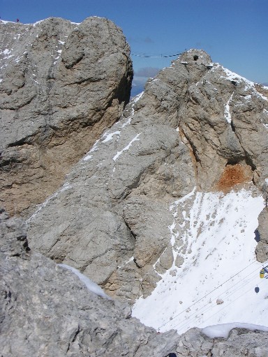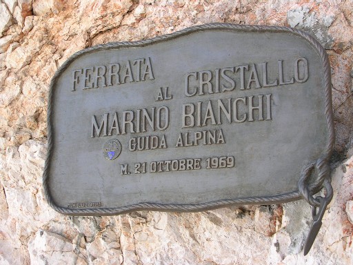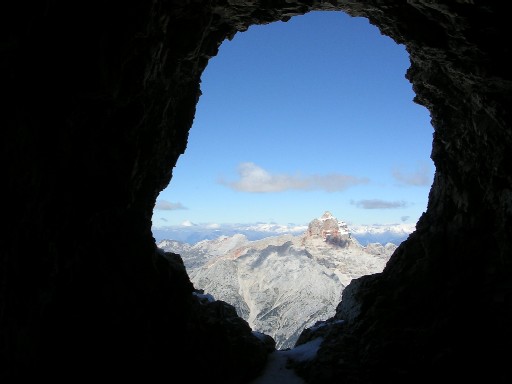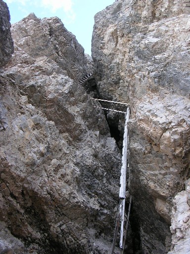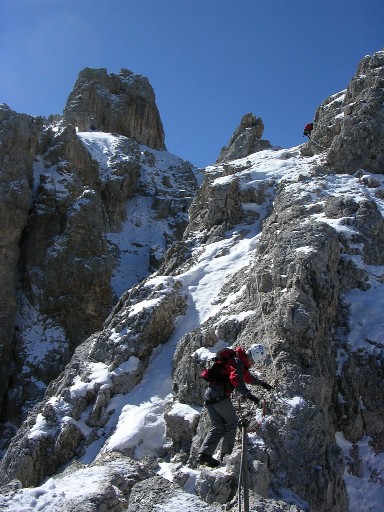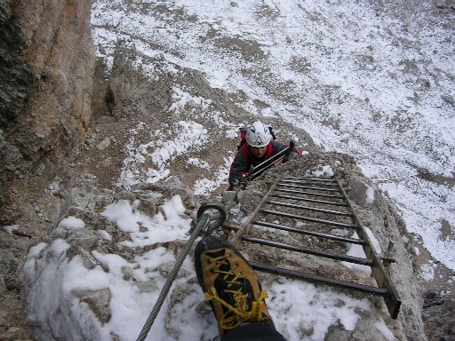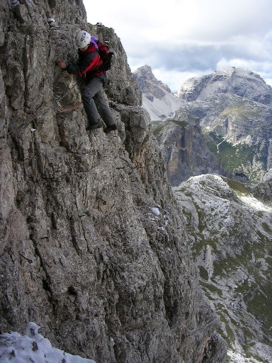 Zatímco ferátka na Toblinger Knoten byla kvalitním zážitkem, pak klettersteig Marino Bianchi na Cima di Mezzo (3154 m n.m.) v masívu Cristallo byla naprosto odstrašujícím případem. Potkali jsme tu výcvikový ferratový kurz nějaké české univerzity. Řeknu to stručně - 30 lidí v lehkých šusťáčkách, téměř podchlazených, nezkušených, všude kolem sníh, vítr, „instruktor“ kdesi v nedohlednu, výbava a způsob navázání až tuhla krev v žilách… Ušli jsme asi 200 metrů a rozhodli se pro návrat, neboť na tohle se fakt koukat nedalo. Cestou zpět jsme potkali tři mladé sympatické lidi z tohoto kurzu, kteří se s námi rozumně vrátili a byli za to velmi vděční. Aby jsme si alespoň trochu spravili chuť, prošli jsme se kousek po ferratě po opačné straně hřebenu, frekventované rovněž více než je zdrávo. Udělali jsme zde pár hezkých snímků a raději to definitivně zabalili.