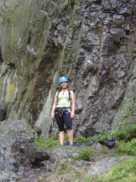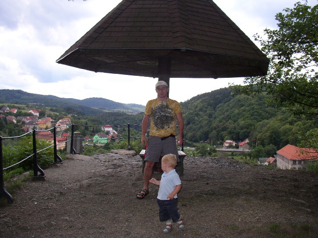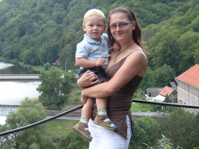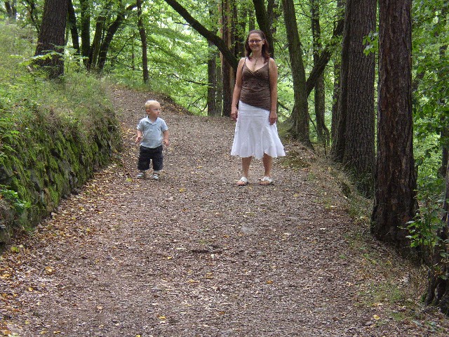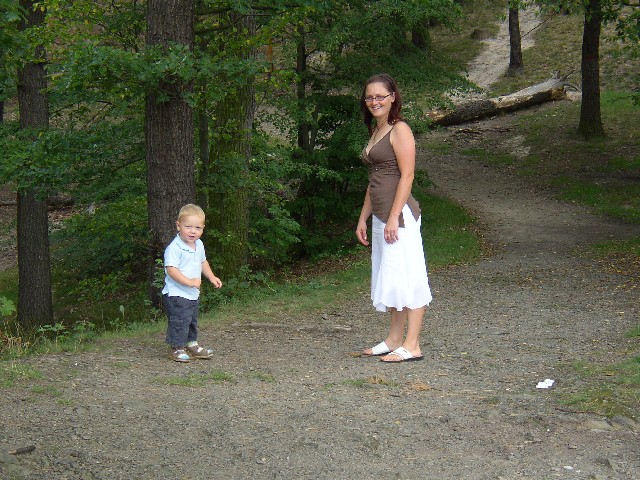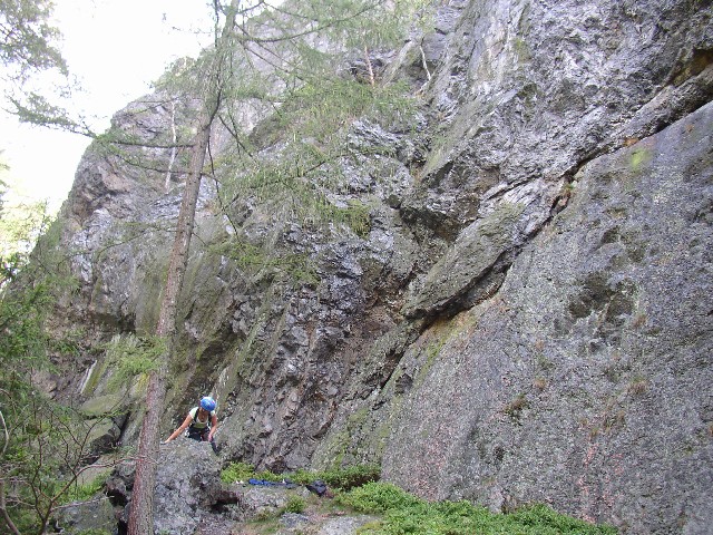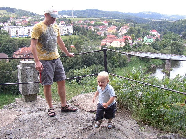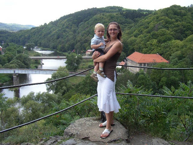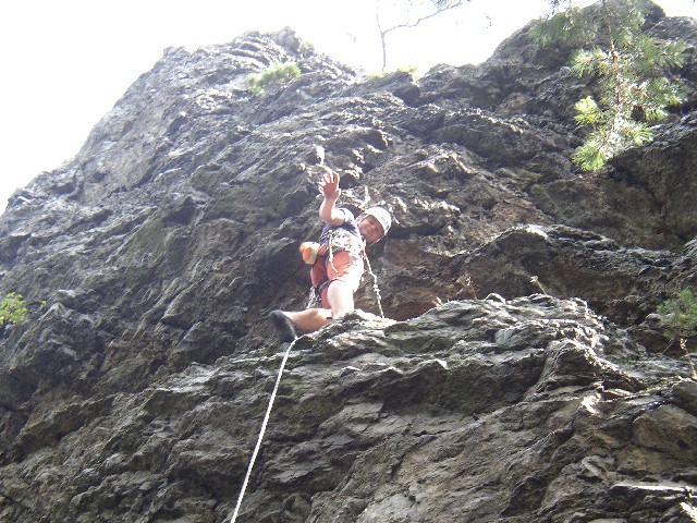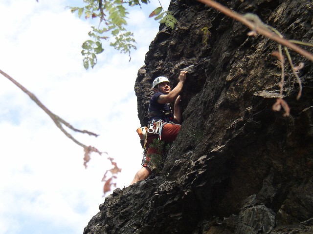 Oslavu jsme zdárně přežili a s čistou hlavou vyrazili směr obec Svatá, odkud už to bylo ke skále jen cca 2km. Nejprve nás zdrželo, když jsem asi půl hodiny chodil okolo bezvýznamného skalního útvaru s průvodcem v ruce a divil se, že se nemůžu trefit do žádné cesty. Lenka se mi už pomalu začínala vysmívat, ale najednou se před námi vynořila nádherná skála vysoká přes 30m s perfektně označenými nástupy. Lence sklaplo a já byl zase chvíli pánem tvorstva. No a pak už jsme jen lezli a lezli a zapisovali se do vrcholových knížek a kochali se nádhernými výhledy z Vraní skály.