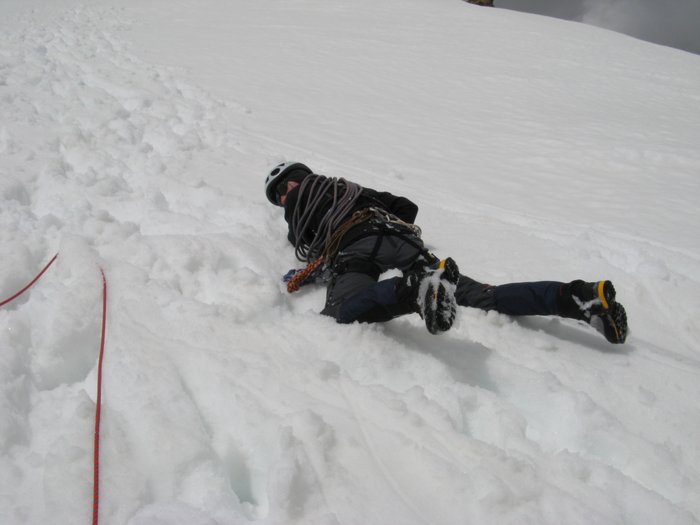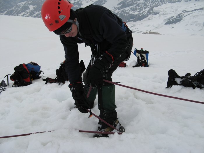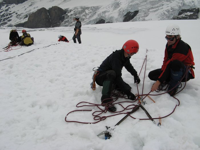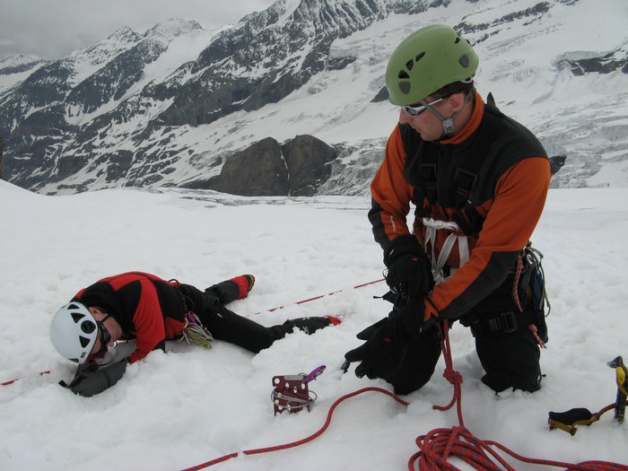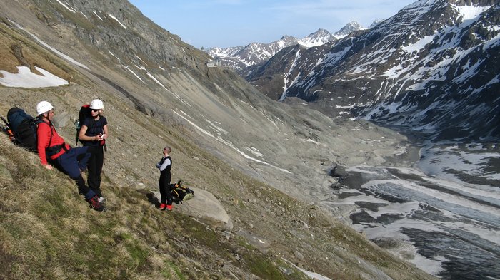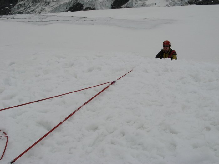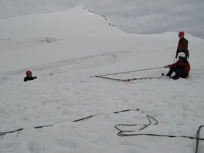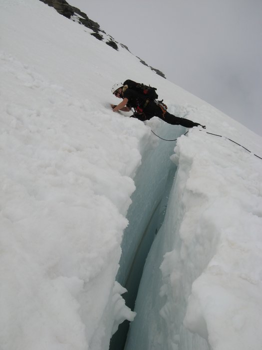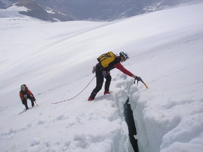 Následující den je věnován aklimatizaci (výstup na Mittl. Bärenkopf - 3356 m) a nácviku základních „ledovcových“ dovedností. Cestou k chatě došlo i na oblíbené skautské hry „Za chvíli nám jede vlak“ s tím rozdílem, že v Alpách se to jmenuje: „Kličkování mezi kroupy a blesky“. Další den jsme strávili opalováním na ledovci s občasným upadnutím do trhliny a následnou záchranou „nemehla“. Nutno podotknout, že kromě Duška jsme si roli „nemehla“ vyzkoušeli všichni. Cenu never more získává skupina Slovinců, která se ze zvědavosti přišla podívat na „nemehlo“ na okraj trhliny a vzhledem k tomu, že „nemehlo“ jsem byl zrovna já, tak ze mě udělali „Mojito“. (pozn. autora: „Mojito“- koktej, který se z převážné většiny skládá z ledové tříště. Výjimku tvoří tzv. „Mojito Krumlovské“ ve kterém převládá rum).