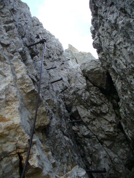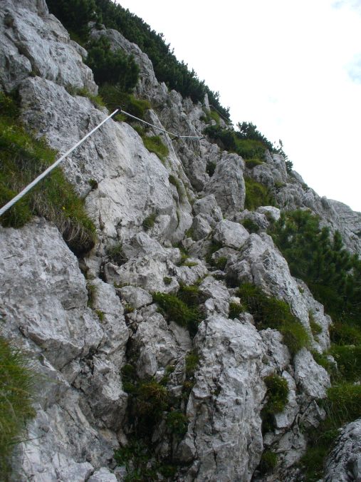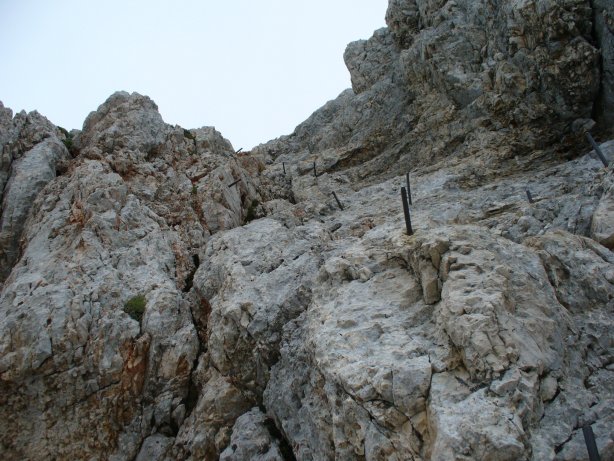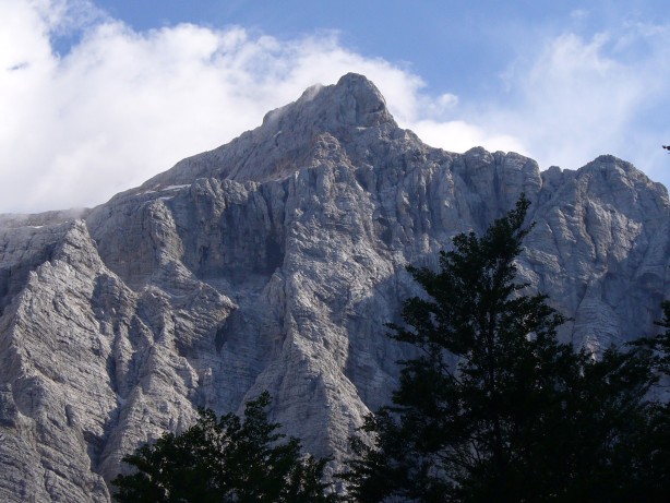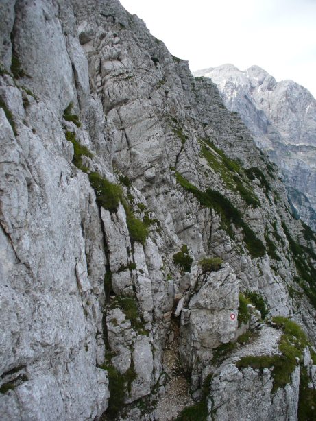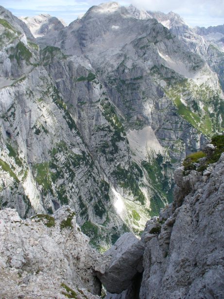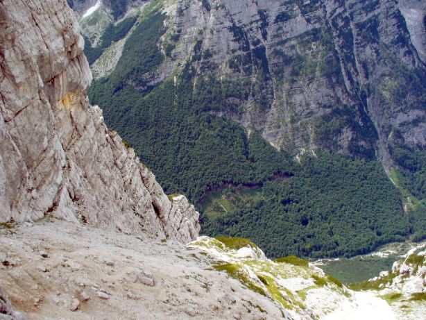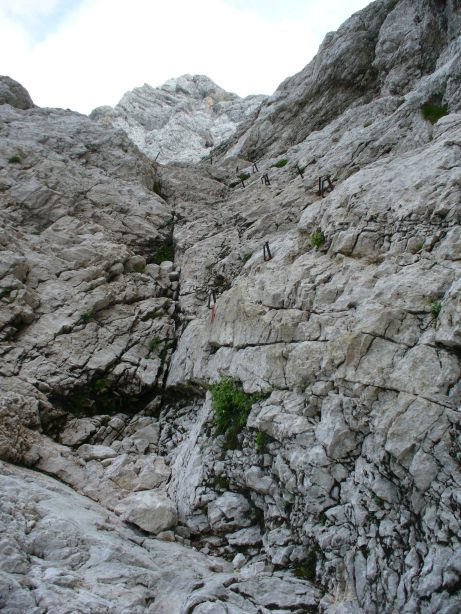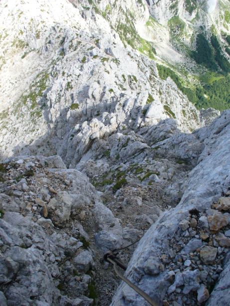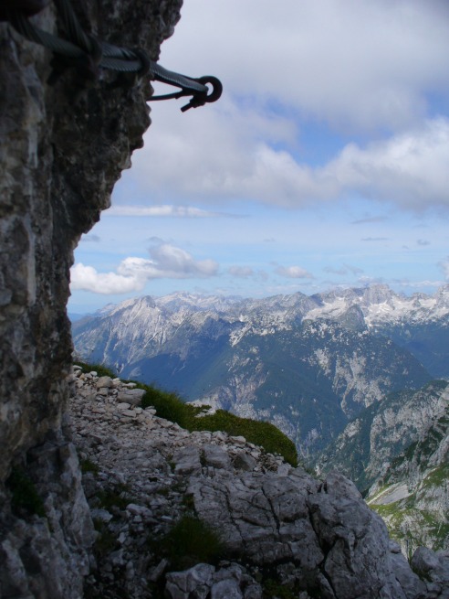 O nejvyšší hoře Julských Alp, Triglavu (2864 m n.m.), se píše hodně. V knižním průvodci jsem se dočet, že výstupy z jihu jsou volnější, ale příšerně dlouhý, čili nic pro LBE. Internetový zdroj neznámého původu uvádí severní stěnu Triglavu mezi slovinskými Top Ten a doporučuje zajímavější cesty od severu. Volba padla na výstup Bambergskou cestou přes sedlo Luknja (1789 m n.m.) a sestup cestou Prag přes Tiglavski Dom. Pohledem do mapy jde de facto o hřebenovku od severu. Těžší úseky jsou zajištěné ocelovým lanem a kramlemi, bez nutnosti úvazku, se píše, čili bereme jenom přilby a jdeme nalehko. Je pátek ráno. Od Aljažev Domu (1015 m n.m.) do sedla Luknja jde o pěknou procházku s „trochou do kopce“. Crescendo moderato. Krásné dvě hodinky na téma proč bydlíme v Praze a jsme v sedle. Hledáme kudy dál… Lacrimoso forte. Po několika krocích Lenka hlásí, že se vrací. Nedivím se, cesta vede strmě vzhůru, sice pořád cesta, ale chápu, že kdo nemusí pohled z výšky, z úzký skalní hrany, že tady končí sranda i cesta. Je rozhodnuto, Lenka maže dolů. A dál jen já a moje trenky. Serioso tremendo.