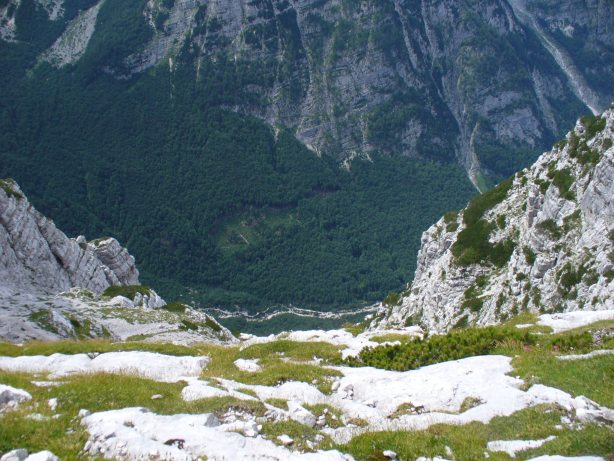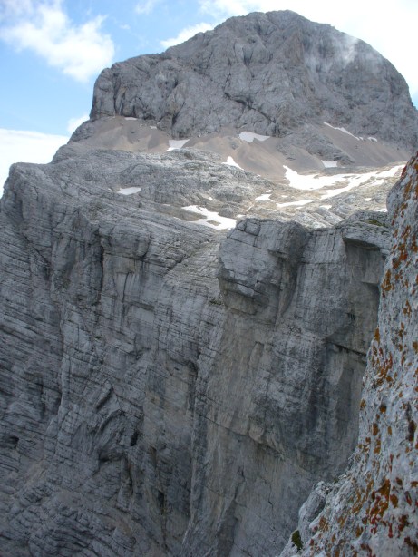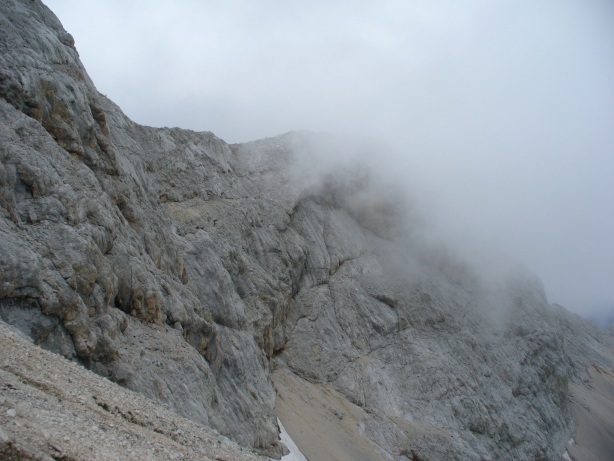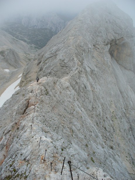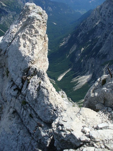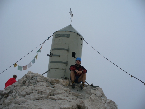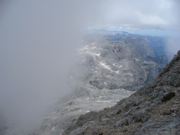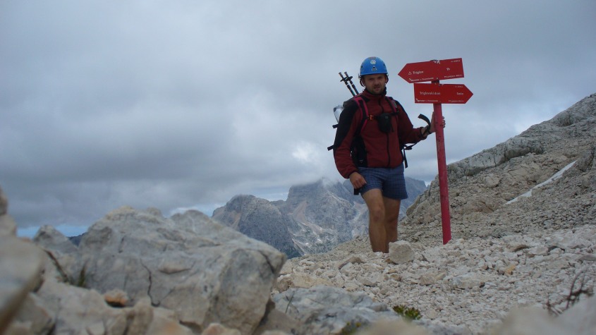 Nahoru to zabralo necelé tři hoďky, většinou po sotva znatelný cestě, místy hodně exponovaně po kramlích, místy i velmi odvážně bez ocelovýho lana. Slušný furioso enfaticamente! Jestliže se píše, že z Triglavu je nejhezčí alpský vrcholový výhled, tak asi jo. Já měl to štěstí, že jsem se nahoře nadýchal čerstvého Stratocumulu, vyfotil se s Aljažev Stolpem (vrcholový artefakt), snědl rozbředlou tyčinku a mastil dolu po druhém hřebeni spojující hlavní vrchol a Malý Triglav.