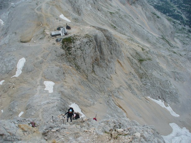Až k chatě Kredarica (Triglavski Dom; 2200 m n.m.) to šlo celkem slušně. Počet lidí na chatě naznačuje, že o víkendu bude na kopci krapet nacpáno. Pochopil jsem, že přespat tady se ale vyplatí. Bandasky nateklý a sestupový Grande Finale po lanem nejištěných kramlích jsem měl teprve před sebou. Za zpěvu „Som sračka perfektně urobená“ a dvojnásob ve střehu jsem byl dole za 3 hoďky. V hlavě mi hučelo jako kráva. Eroico estinto.